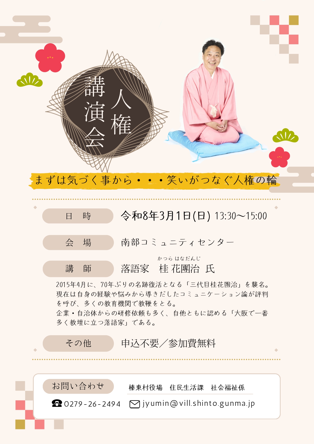人権講演会 「まずは気づくことから…笑いがつなぐ人権の輪」 日時:2026年3月1日(日) 13時30分から15時00分まで 場所:南部コミュニティセンター 講師:落語家 桂 花團治 氏 参加費:無料/申込不要 お問合せ […]