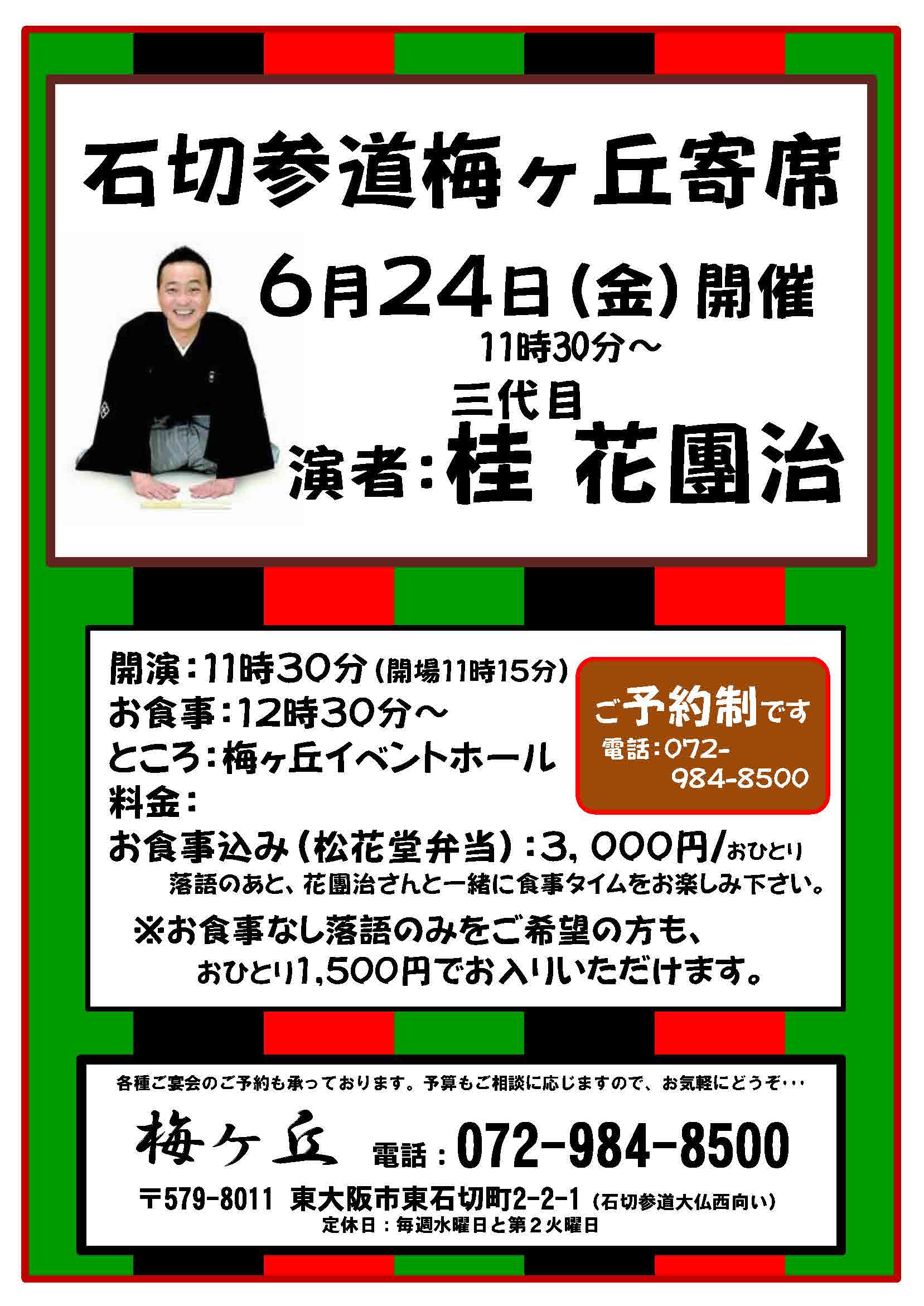 石切参道「梅ヶ丘寄席」 6月24日(金)11時30分~12時30分 (このあと、お食事を召しあがっていただきます)
