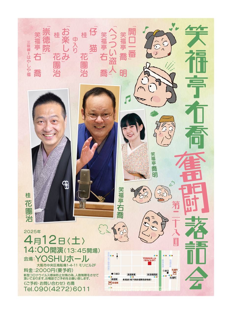 番組: 「開口一番」笑福亭 喬明 「へっつい盗人」笑福亭 右喬 「仔猫」桂 花團治 <中入> 「お楽しみ」桂 花團治 「崇徳院」笑福亭 右喬