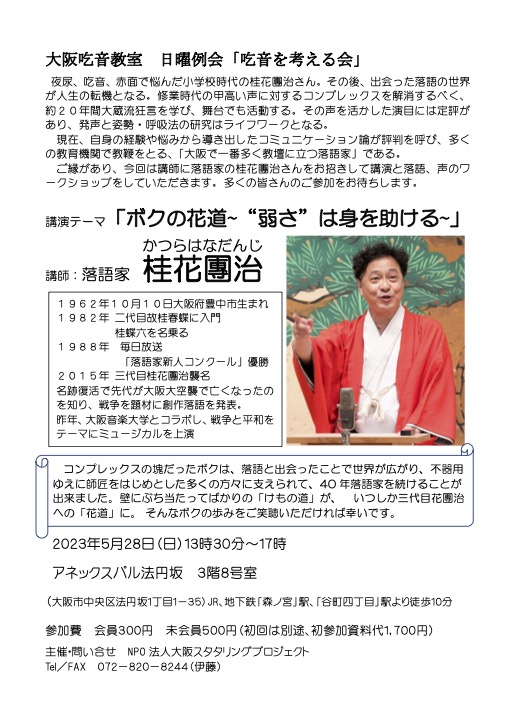 ご縁があり、今回は講師に落語家の桂花團治さんをお招きして講演と落語、声のワ ークショップをしていただきます。多くの皆さんのご参加をお待ちします。