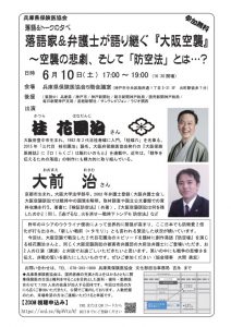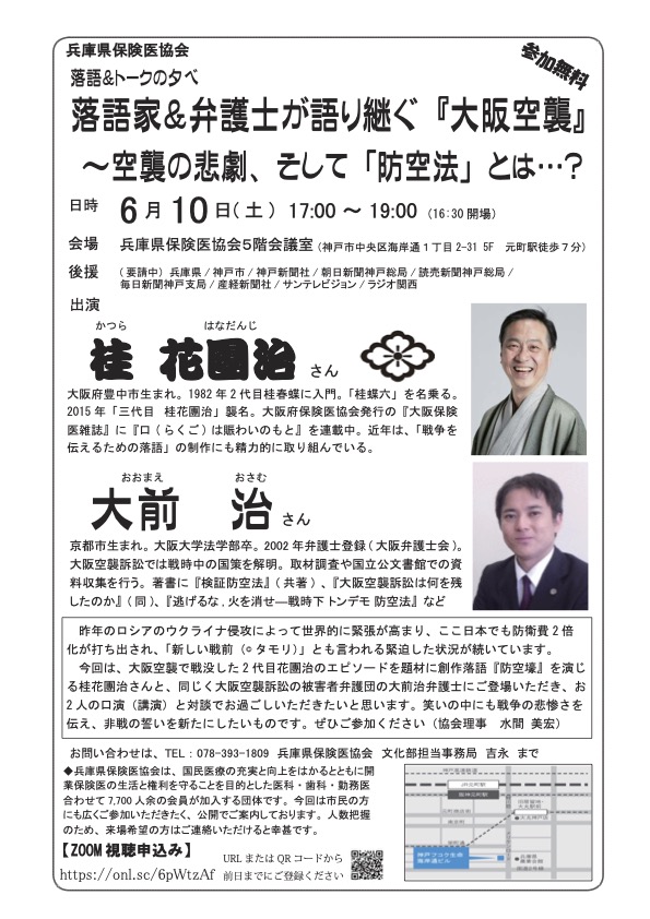 昨年のロシアのウクライナ侵攻によって世界的に緊張が高まり、ここ日本でも防衛費 2 倍 化が打ち出され、「新しい戦前(© タモリ)」とも言われる緊迫した状況が続いています。 今回は、大阪空襲で戦没した 2 代目花團治のエピソードを題材に創作落語『防空壕』を演じ る桂花團治さんと、同じく大阪空襲訴訟の被害者弁護団の大前治弁護士にご登場いただき、お 2 人の口演(講演)と対談でお過ごしいただきたいと思います。笑いの中にも戦争の悲惨さを 伝え、非戦の誓いを新たにしたいものです。ぜひご参加ください。